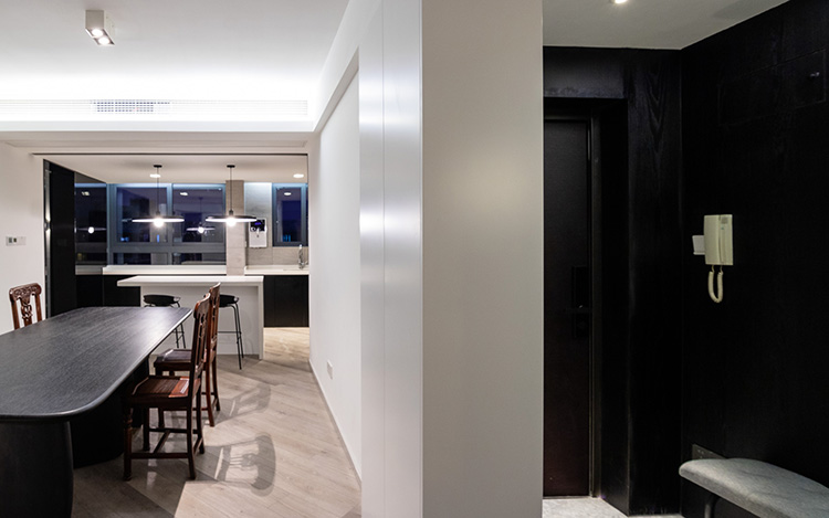 ▲门套和电表箱门,通过黑色木饰面整合成为一个整体。